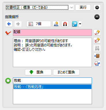 ルールを作り込むのが面倒なので、とりあえずの簡易チェックとして「標準(だ・である)」の設定で流したが、指摘としては「配線処理」が「敗戦処理」の誤りじゃないか、とかそういうのが出ていた程度で問題なさそうであった。まぁこれはそのうち設定をちゃんと作ってチューニングしていくといいんだろう……。